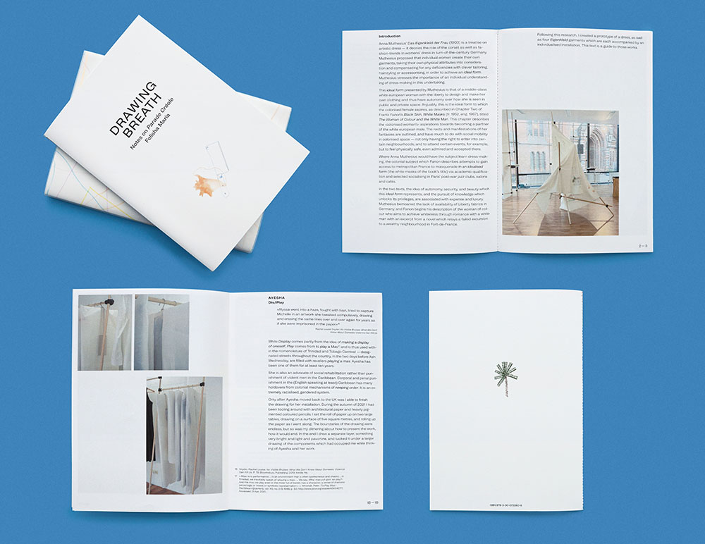 Die Publikation „Drawing Breath” vereint Essay und Dokumentation der künstlerischen Auseinandersetzung von Felisha Maria im Bezug auf den eigenen sozio-politischen Kontext. Die Publikation entstand anlässlich des von Felisha Maria kuratierten Festivals „Parade Créole“, bei dem sie ihre Werke neben anderen künstlerischen Positionen ausstellte. Durch das Medium Zeichnung untersucht sie Mittel, mit denen sich der kolonisierte weibliche Körper innerhalb des europäisierten Raumes zu behaupten versucht. Die Künstlerin hat eine Art maßgeschneiderte Uniform für sich selbst und drei Frauen aus der anglo-karibischen Diaspora entworfen. Ihre Forschung basiert auf Prinzipien von Anna Muthesius und dem von Muthesius konzipierten Eigenkleid der Frau. (Design und Foto: Káschem Büro)