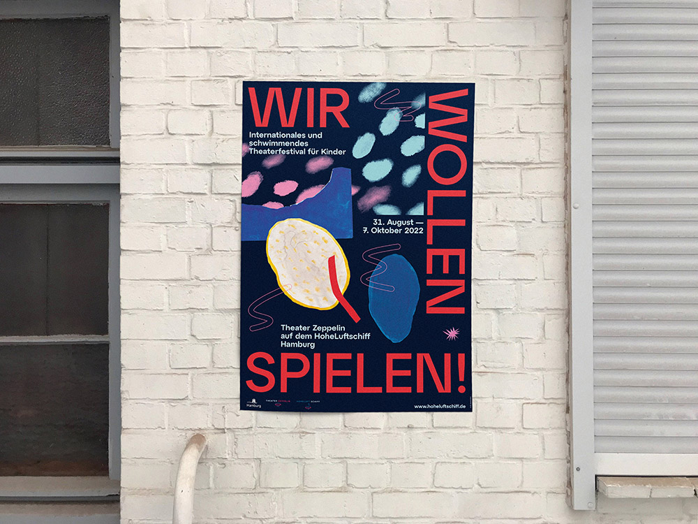Postergestaltung und Erscheinungsbild für das Kindertheaterfestival „Wir wollen spielen!“. Das Festival zeigt Stücke, die Kindertheater zukunftsweisend und interdisziplinär denken. Dazu wurden nationale und internationale Theater-, Tanz- und Performance-Ensembles für eine Gastspielreihe eingeladen, welches im Theater Zeppelin auf dem HoheLuftschiff in Hamburg stattfand. Káschem konzipierte das Corporate Design für das Theaterfestival. (Design und Foto: Káschem Büro)