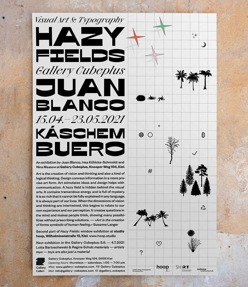 Die Ausstellung „Hazy Fields“ zeigte grafische Arbeiten von Káschem Büro zusammen mit Arbeiten des Künstlers Juan Blanco. Die ausgestellten Arbeiten nehmen zum Teil Bezug aufeinander und erforschten gestalterische sowie gedankliche Schnittstellen der Bereiche Kunst und Design. Das für die Ausstellung gestaltete Plakat beinhaltet grafische Elemente, die in Juan Blancos Gemälden und Collagen immer wieder auftauchen. (Design und Foto: Káschem Büro)