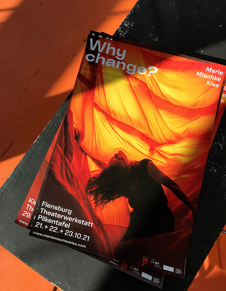 Posterreihe für das Tanzstück „Why Change? Are you not okay with how things are?”. In dem Stück beschäftigt sich das Performancekollektiv Merle|Mischke|Klee mit der Reaktion des Körpers auf private, gesellschaftliche und (klima-)globale Veränderungen. Die Tänzer*innen Coralie Merle und Mark Christoph Klee sowie der Spoken Word Performer Jasiek Mischke erzeugen zusammen mit dem Bühnenbild von Guusje de Bruin und Sarah Kerbosch einen Zustand, in dem auch die Zuschauern*innen spüren, was es heißt, in konstanter Transformation zu sein und mit immer neuen Gegebenheiten umzugehen. (Design und Foto: Káschem Büro; Plakatfotografie: Sjoerd Derine)