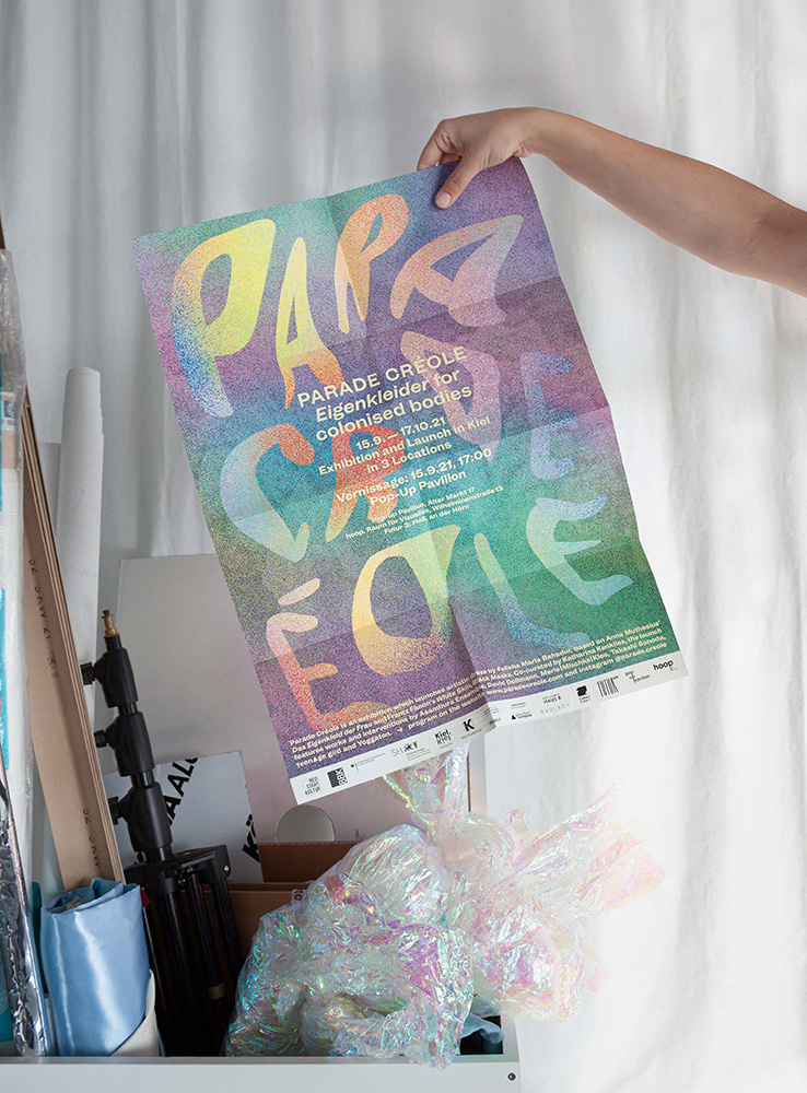 Das mehrtägige Kunstfestival „Parade Créole – ‚Eigenkleider‘ for colonized bodies“ fand in Kiel unter der künstlerischen Leitung von Felisha Maria statt. Das Programm vereinte verschiedenste künstlerische Positionen aus den thematischen Bereichen Identität, Körperlichkeit und Selbstinszenierung, vor allem im Kontext von Kolonialisierung oder der Befreiung davon. Káschem konzipierte das Corporate Design für das Festival. (Design und Foto: Káschem Büro)