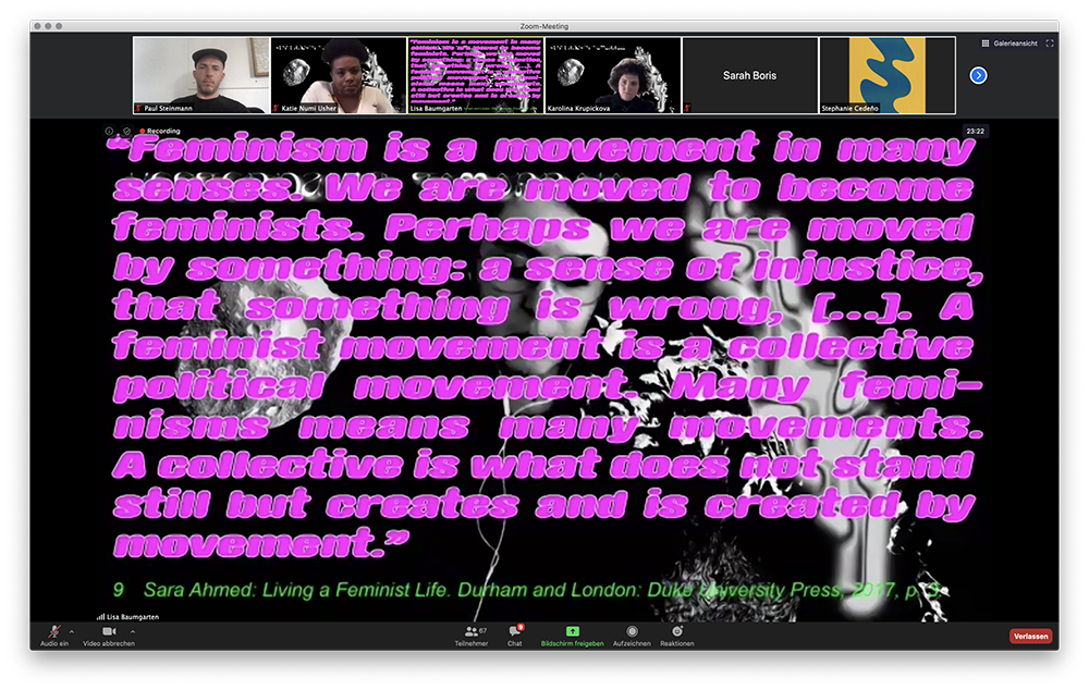 „Fullscreen Footnotes“ Performance in 2020. Organisiert und gehostet von Central St. Martins Absolventin Karolina Krupickova. Die Performance kam zustande, als u. a. Lisa Baumgarten gebeten wurde einen Text für eine bekannte Designzeitschrift – als Einführungstext in Feminismus, Design und Designausbildung – für deren Rubrik „Diskurs“ zu schreiben. Es stellte sich jedoch heraus, dass die Herausgeber die Fußnoten und Anmerkungen nicht gedruckt und den Text ohne ihre Zustimmung bearbeitet hatten. In der Performance wurden die Fußnoten im Vollbildmodus präsentiert.