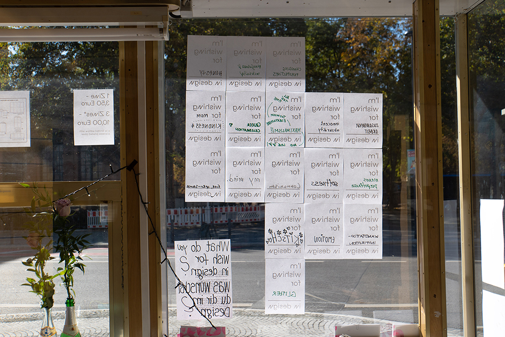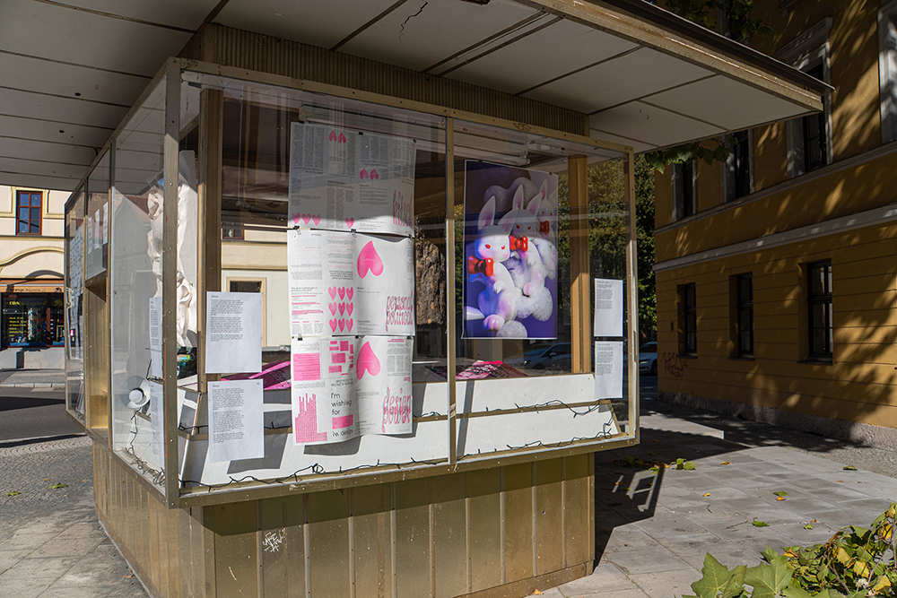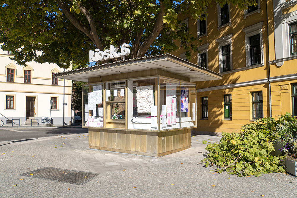 Vom 07.-09.10.22 fand dann die Ausstellung zum Projekt statt. Als Location entschieden sich Hannah und Jay für den Kiosk.6, welcher ihnen von der studentischen Initiative Marke.6 für diese Zeit zur Verfügung gestellt wurde. Sie nutzten den unter Denkmalschutz stehenden Kiosk aus DDR-Zeiten auf dem Sophienstiftplatz, um ihre entstandenen Ergebnisse zu präsentieren und auch, um die Publikation bzw. einzelne Zines/Poster zu verkaufen. Neben zwei Postern in A1 Farbdruck, stellten sie auch die Skulptur aus, welche im Fenster hing und nachts pink beleuchtet wurde. Die selbstgebauten Siebdruckrahmen sowie ungefalteten Zines wurden ebenfalls in die Fenster gehangen und konnten so begutachtet werden. Diese Ausstellungsstücke waren jederzeit von Außen sichtbar. Wer eine Publikation oder Zine/Poster erwerben wollte, konnte dies zu den Öffnungszeiten, wenn die beiden anwesend waren.