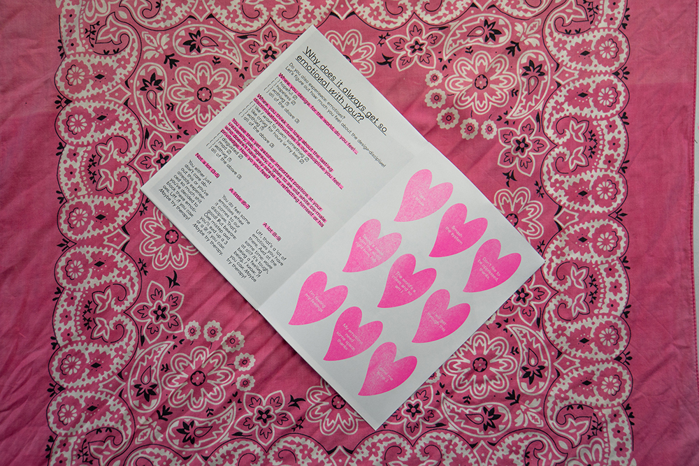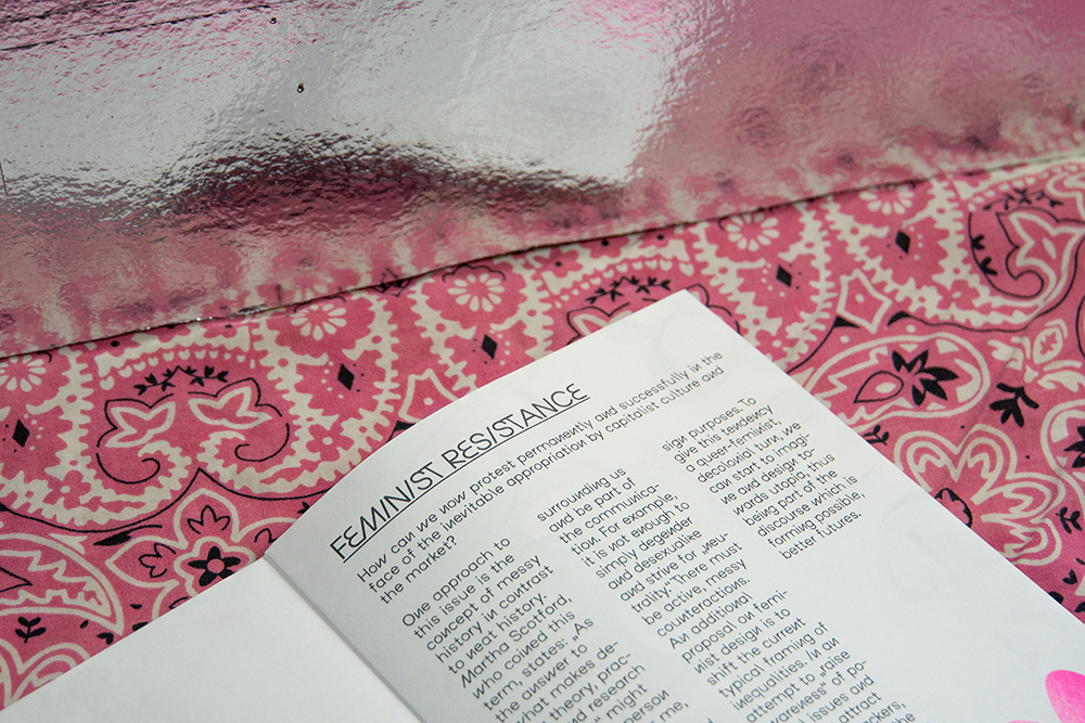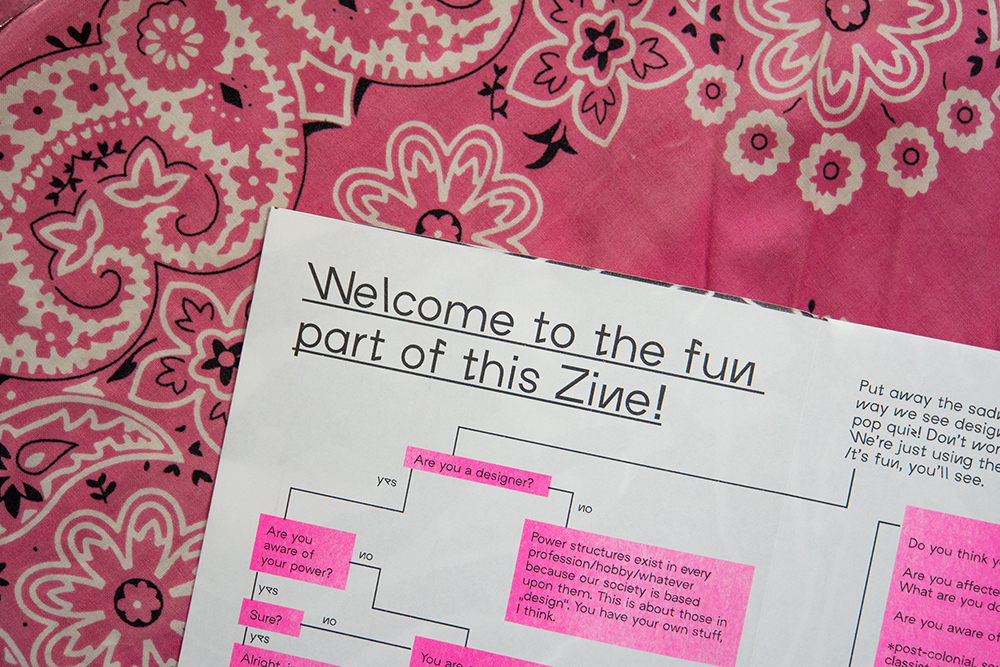 Zines sind eine schnelle und praktische Möglichkeit, sich selbst ein kleines Büchlein zu machen. Sie waren in der Vergangenheit in der Queer-, Feminismus- und Punk-Bewegung weit verbreitet und machen immer noch einen großen Teil der queer-feministischen „DIY”-Bubble aus. Sie sind einfach zu machen und ebenso einfach zu verbreiten. Als Hommage an diese späten queer-feministischen Punk-Zines haben Hannah und Jay dieses Format auch für ihre Publikation gewählt. Es gibt drei Zines. Das erste „Power” beschäftigt sich mit Machtstrukturen im Design und stellt Fragen und Wünsche, was sich ändern sollte, könnte, müsste. Das zweite „Personal” ist ein tiefes Eintauchen in Emotionen, die bei der Arbeit an einem feministischen und damit auch aktivistischen Projekt entstehen. Das dritte Zine „Kitsch” ist ein Essay über die Geschichte und Bedeutung von Niedlichkeit und Kitsch und darüber, wie sie vom Feminismus genutzt werden können. Auf der anderen Seite der Zines befinden sich Poster, die das Thema des Zines selbst repräsentieren. Sie wurden auf einem A2-Risodrucker mit Schwarz und „fluorescent pink” gedruckt.
